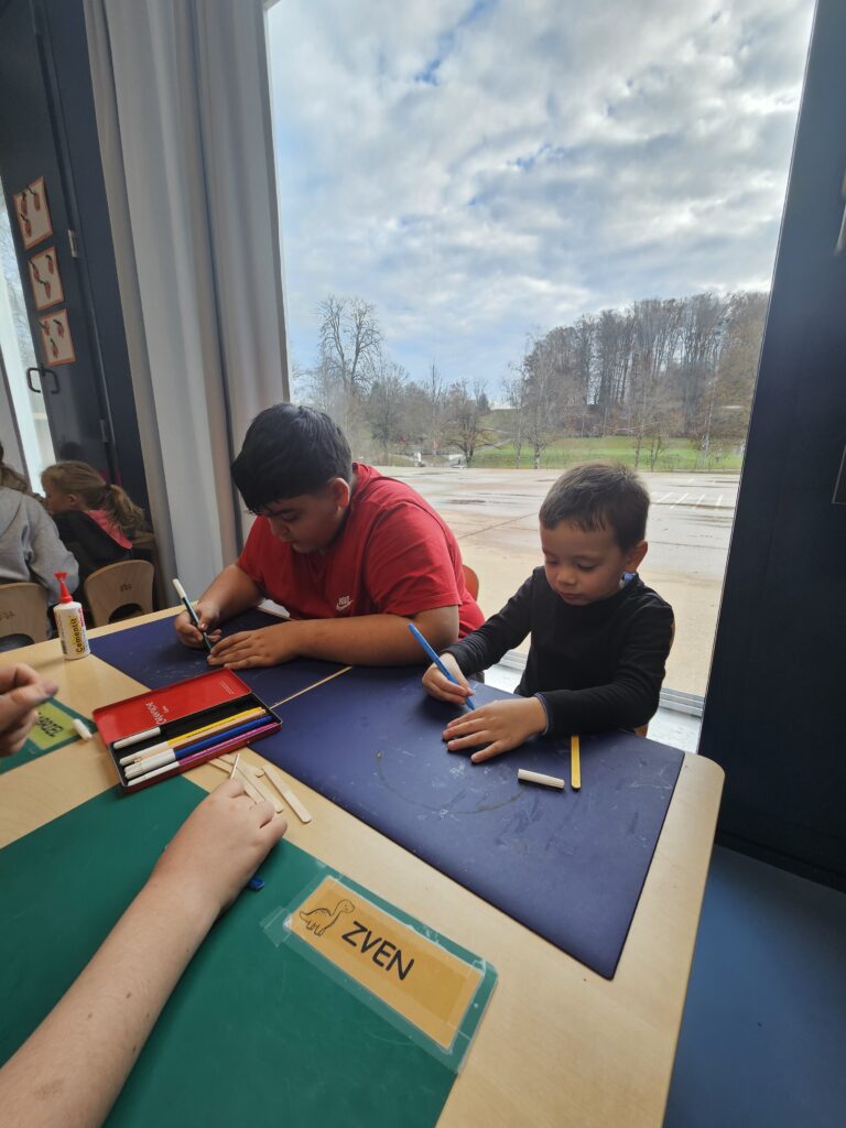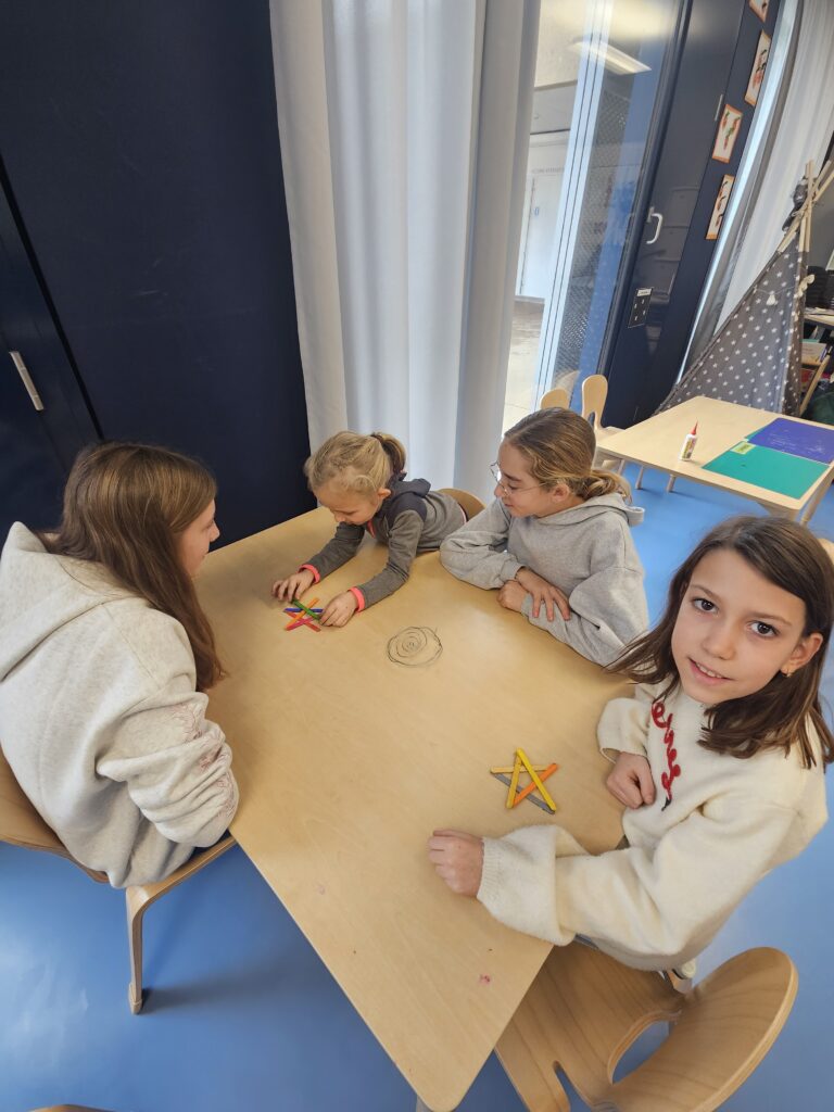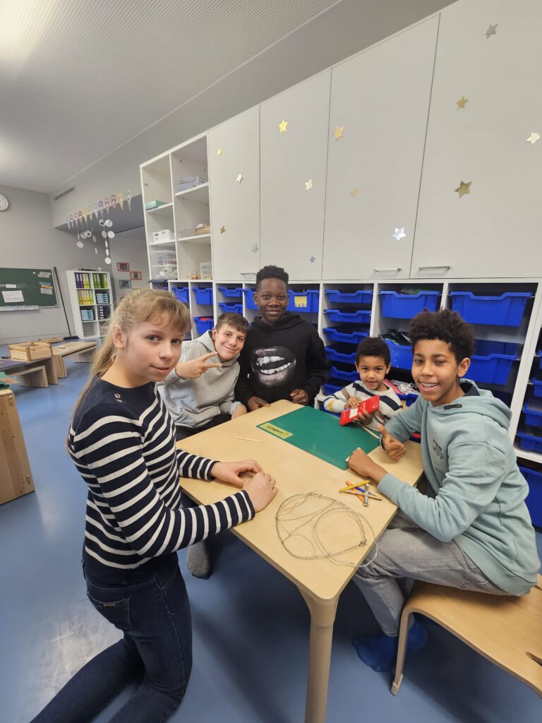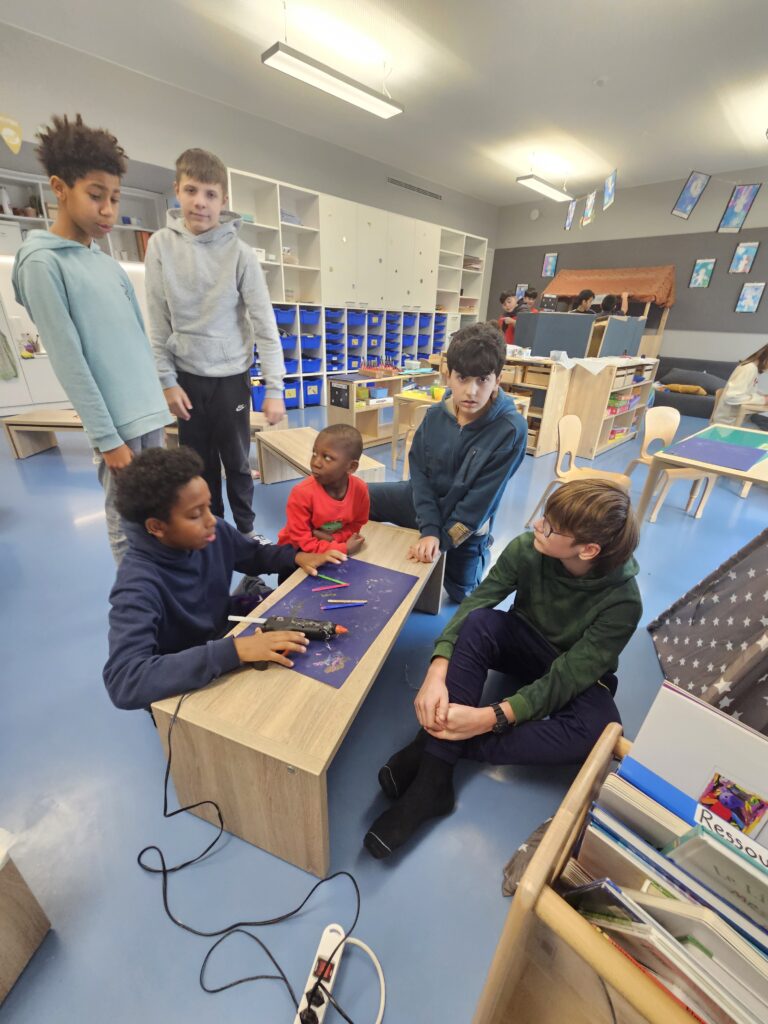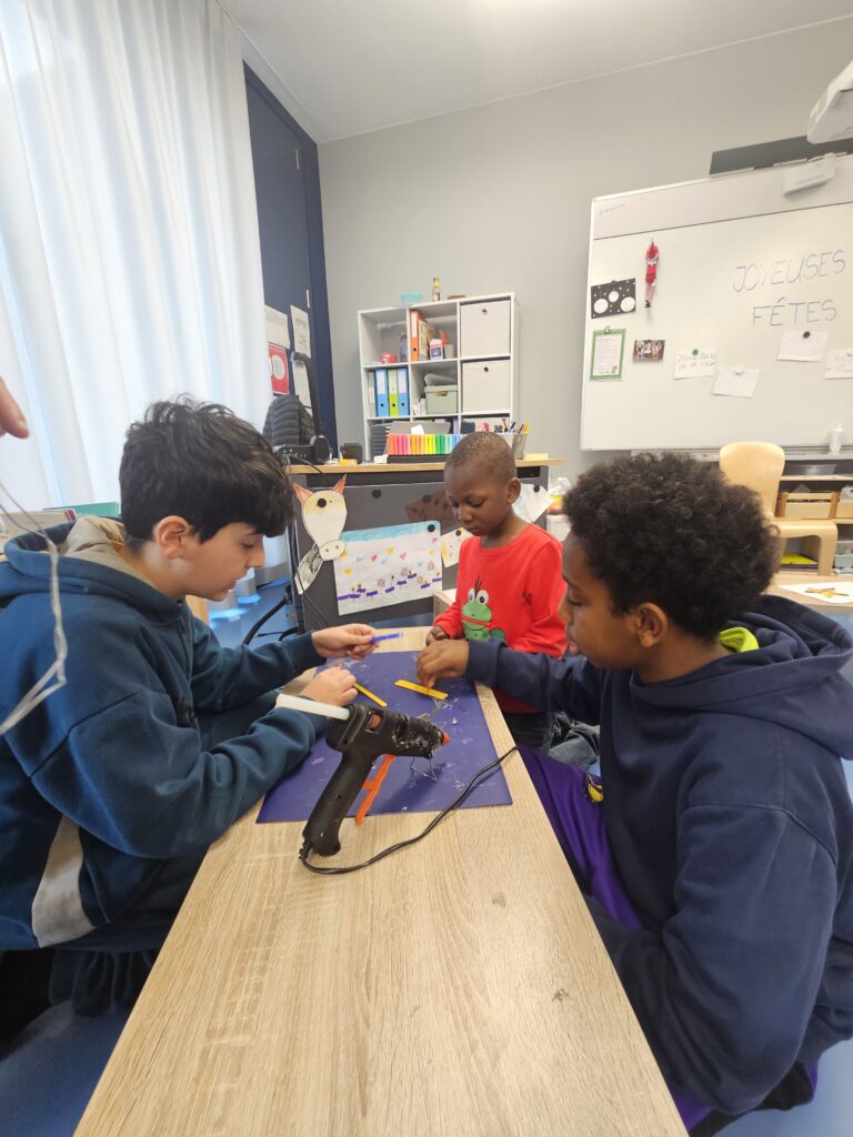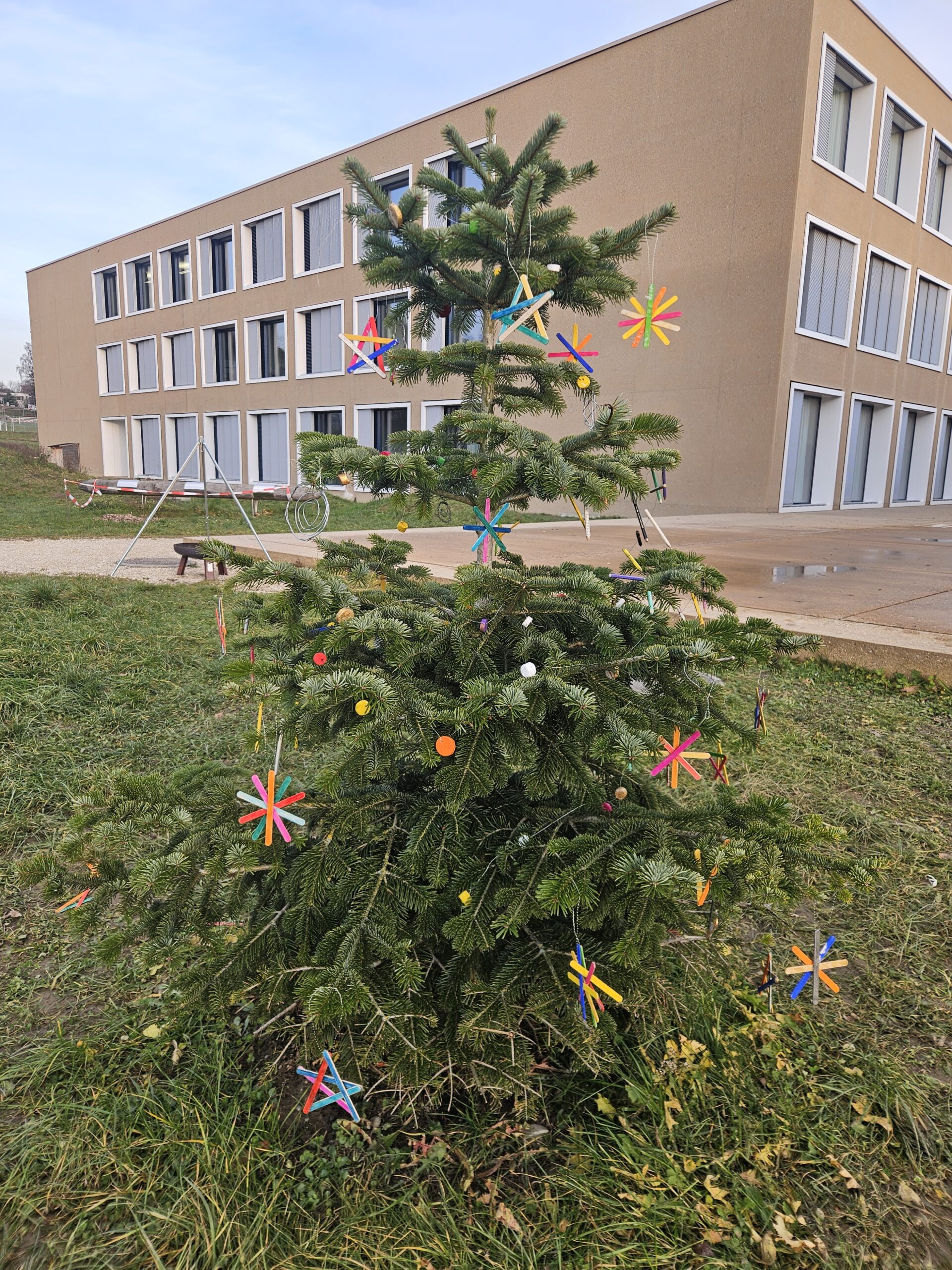 Les élèves de 1–2H de Fanny et de 8H de Guillaume et Marion ont uni leurs forces pour créer et installer de jolies décorations sur le sapin du Platy.